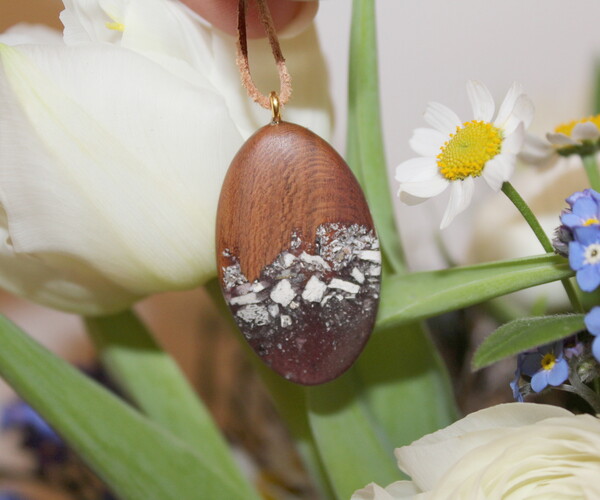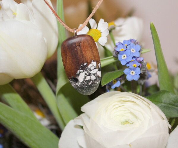 Jakob Wimmer erzählt: „Im ersten Lockdown habe ich zum ersten Mal einen Kettenanhänger aus Holz und Epoxidharz angefertigt. Der fertige Anhänger ist sehr gut angekommen und ich wurde von Carolin Hoffeld gefragt, ob man in den transparenten Teil des Schmucks auch menschliche Asche einarbeiten könne. Also habe ich kurze Zeit später Versuche gemacht, inwiefern solch eine Verarbeitung möglich ist, und schließlich die ersten Prototypen angefertigt.“