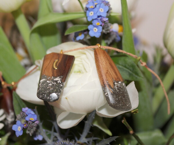 „Jeder Anhänger ist ein Unikat, das Holz nicht immer gleich und die eingearbeitete Asche- und Splittermenge von Stück zu Stück verschieden. Daher bedarf es in allen Produktionsschritten (gießen, schneiden, schleifen, polieren, …) höchste Konzentration und Präzision, um aus den sehr unterschiedlichen Bestandteilen etwas Tolles zu erzeugen.“
